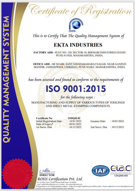 EKTA Industries is proud to be an ISO certified company, ensuring the highest quality standards in the automotive sector. Since our establishment in 2017, we have been committed to delivering premium press products, tools & dies, and machined parts. Our certification reinforces our dedication to providing on-time delivery and meeting the strict quality requirements of modern automotive industries. With over 25 satisfied customers, we have successfully supplied 45 different types of press parts, solidifying our reputation for reliability and excellence.